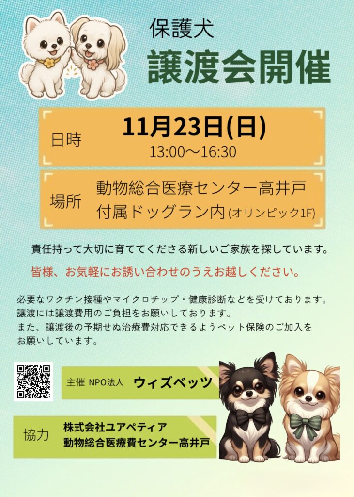 お知らせ 高井戸譲渡会開催 2025.11.17 11月23日(祝) 動物総合医療センター高井戸付属ドッグランにて 譲渡会を開催いたします。 保護犬達が本当の家族と素敵なクリスマスを迎えられるよう、是非、皆様、お誘い合わせうえ、お越しください。