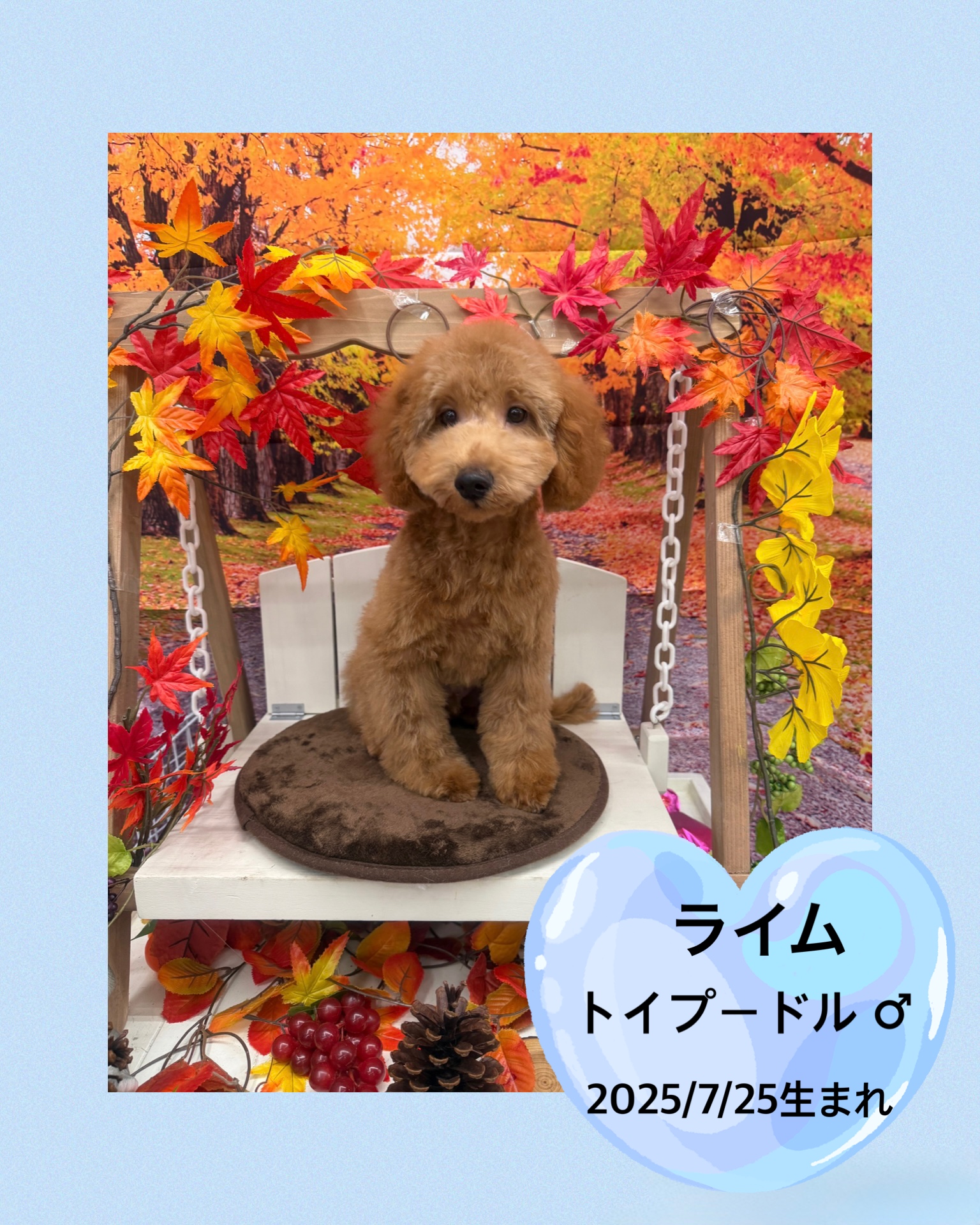 掲載日 2025.11.28 ユアペティア鎌ヶ谷店 がっちりミニチュアサイズのライム 名前 ライム 品種 トイプードル 性別 男の子 生年月日 2025/7/25 ワクチン接種 済み 避妊去勢手術 未 狂犬病予防接種 未 健康診断 あり ノミマダニ予防 済み マイクロチップ 装着済み 犬:フィラリア検査 猫:エイズ、白血病検査 陰性 健康上の特記事項 特になし 11/21現在 3.5kgミニチュアサイズのプードルちゃんです。 すだちと体格ブラザーズです。 怖がりさんな面がありますが、控えめにしっぽを振って寄ってきてくれます。 最近ボール遊びを覚えてしまいました。 < 前のページへ 次のページへ >