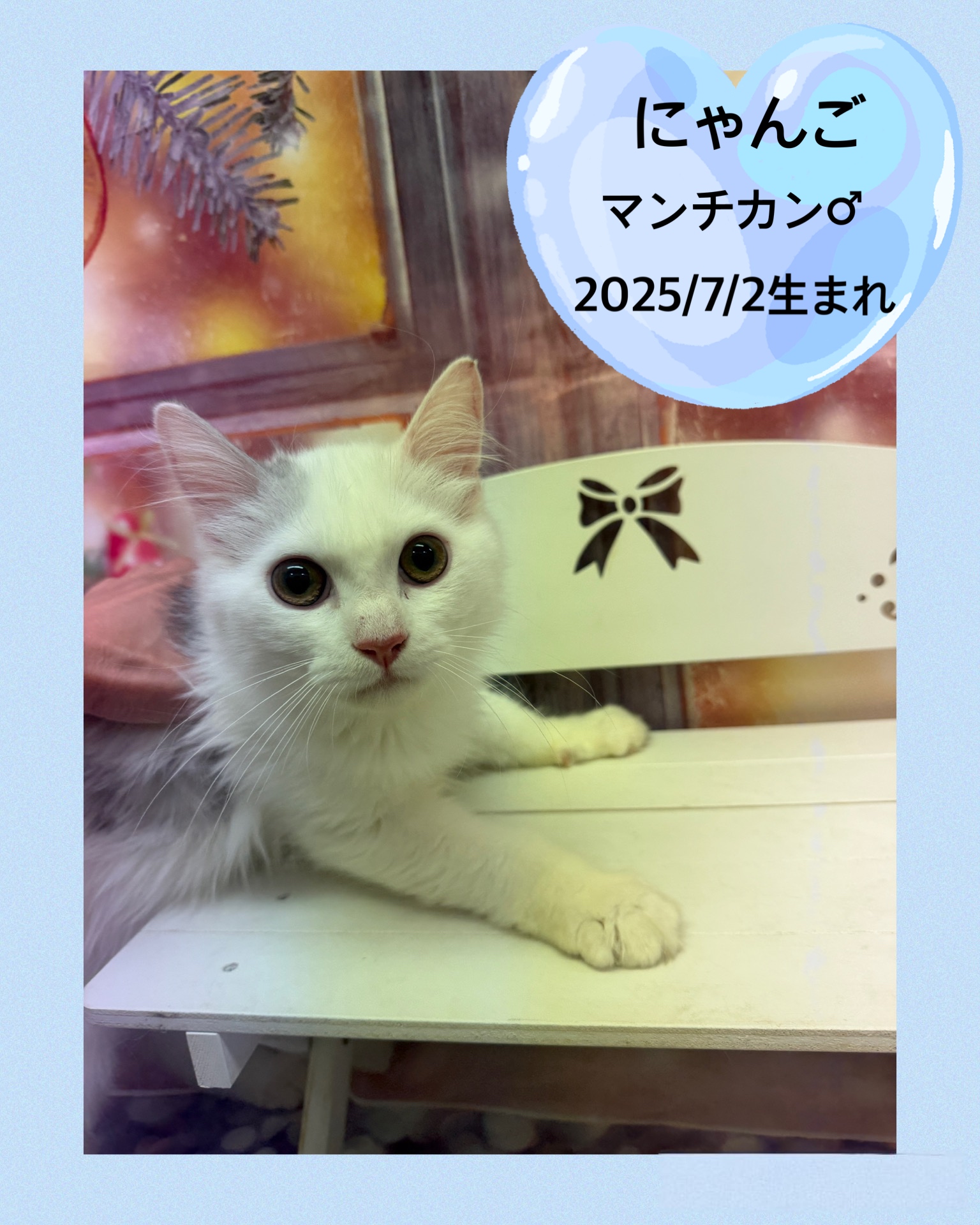 掲載日 2025.12.03 ユアペティア鎌ヶ谷店 淡いカラーが綺麗なにゃんご 名前 にゃんご 品種 マンチカン 性別 男の子 生年月日 2025/7/2 ワクチン接種 済み 避妊去勢手術 未 狂犬病予防接種 猫のため不要 健康診断 あり ノミマダニ予防 済み マイクロチップ 装着済み 犬:フィラリア検査 猫:エイズ、白血病検査 陰性 健康上の特記事項 < 前のページへ 次のページへ >