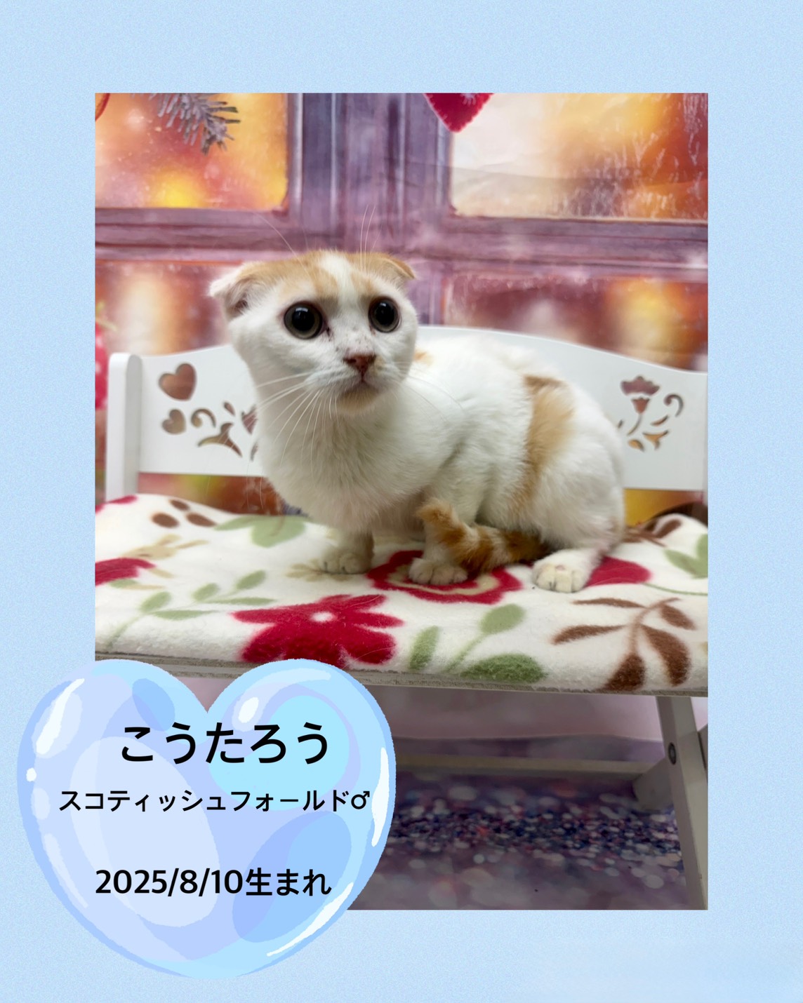 掲載日 2025.12.21 ユアペティア鎌ヶ谷店 少し怖がりな男の子こうたろう 名前 こうたろう 品種 スコティッシュフォールド 性別 男の子 生年月日 25/8/10 ワクチン接種 済み 避妊去勢手術 未 狂犬病予防接種 猫のため不要 健康診断 あり ノミマダニ予防 済み マイクロチップ 装着済み 犬:フィラリア検査 猫:エイズ、白血病検査 陰性 健康上の特記事項 25/12/21現在体重1.7㎏ < 前のページへ 次のページへ >