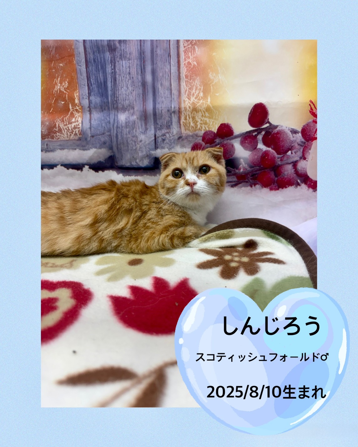 掲載日 2025.12.21 ユアペティア鎌ヶ谷店 シャイな性格の男の子しんじろう 名前 しんじろう 品種 スコティッシュフォールド 性別 男の子 生年月日 25/8/10 ワクチン接種 済み 避妊去勢手術 未 狂犬病予防接種 猫のため不要 健康診断 あり ノミマダニ予防 済み マイクロチップ 装着済み 犬:フィラリア検査 猫:エイズ、白血病検査 陰性 健康上の特記事項 25/12/21現在体重1.42㎏ < 前のページへ 次のページへ >