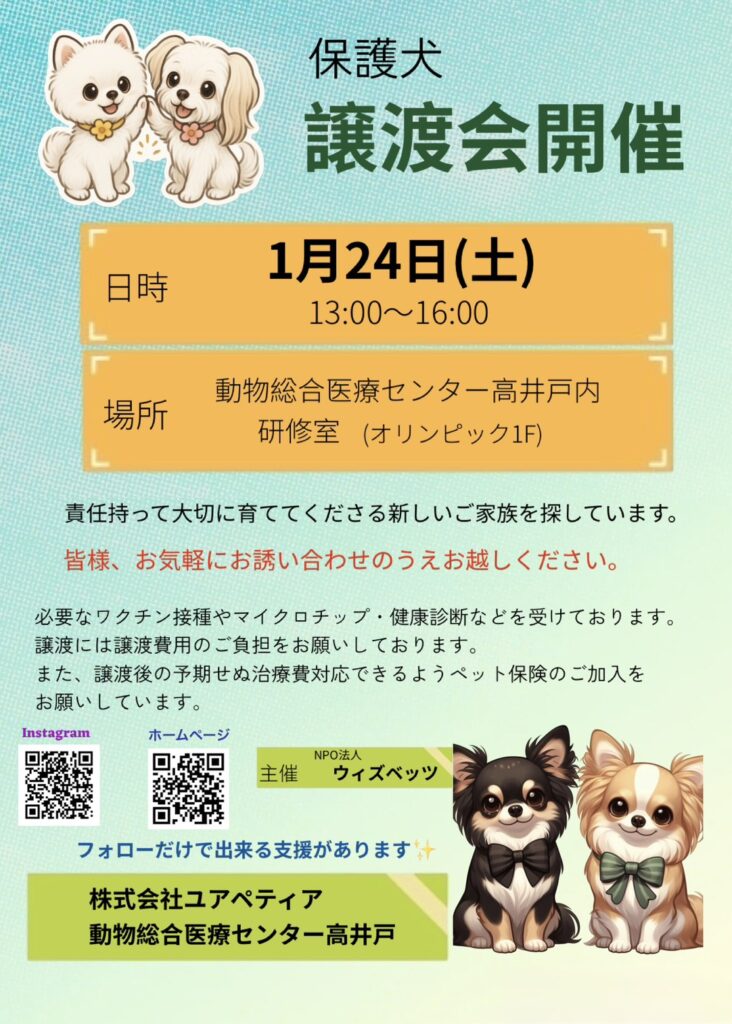1月24日(土)に動物総合医療センター高井戸(オリンピック高井戸店1F)にて保護犬譲渡会を行います。