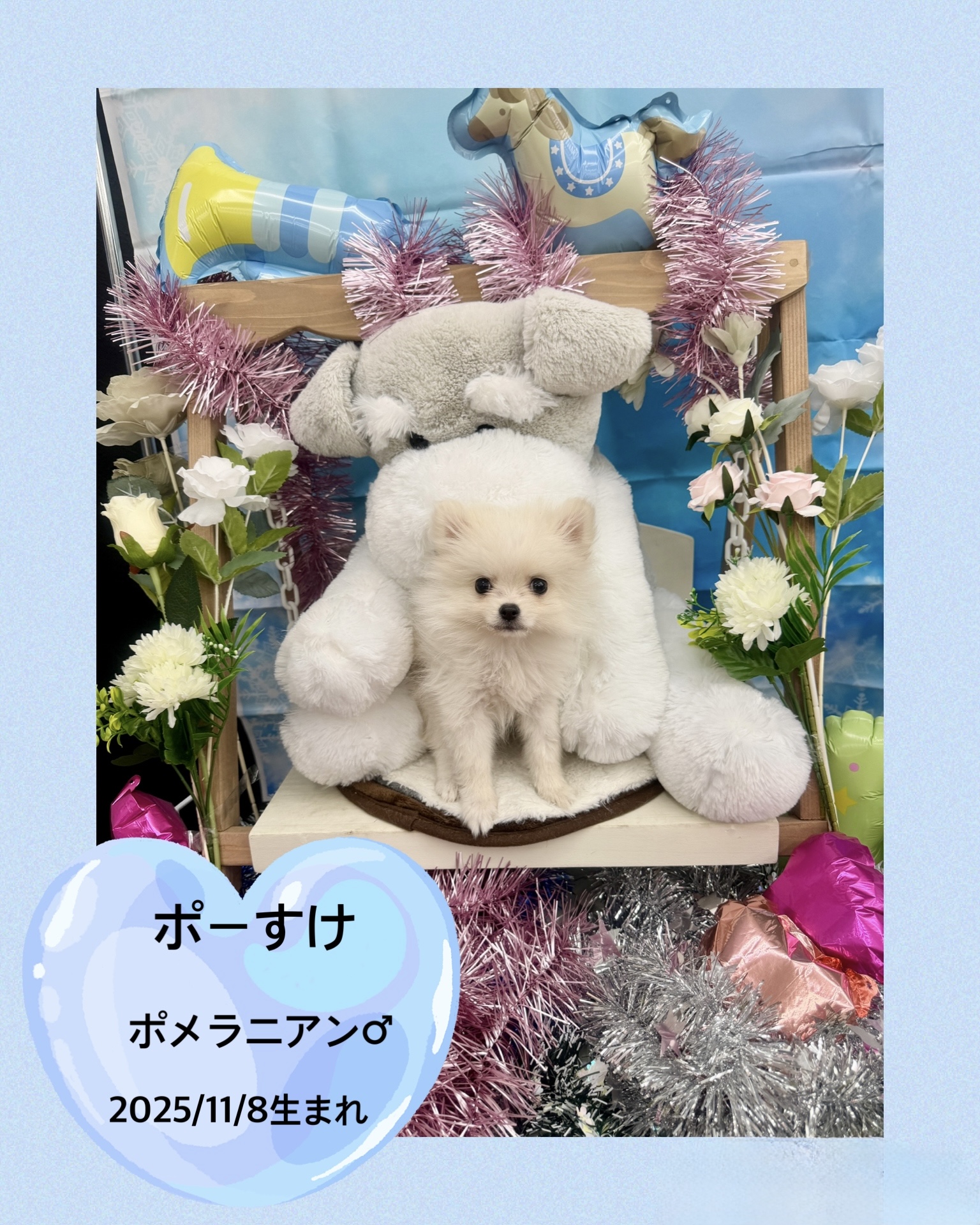 掲載日 2026.02.01 ユアペティア鎌ヶ谷店 小さくてもしっぽフリフリ【ポーすけ】 名前 ポーすけ 品種 ポメラニアン 性別 男の子 生年月日 2025/11/8 ワクチン接種 済み 避妊去勢手術 未 狂犬病予防接種 未 健康診断 あり ノミマダニ予防 済み マイクロチップ 装着済み 犬:フィラリア検査 猫:エイズ、白血病検査 陰性 健康上の特記事項 パテラ右G1・泉門(中) 小さくてもご飯モリモリしっぽフリフリとっで可愛らしい男の子です。 尾の付け根若干、毛が薄めですが、次第に生え揃うと思われます。 1月31日:850g < 前のページへ