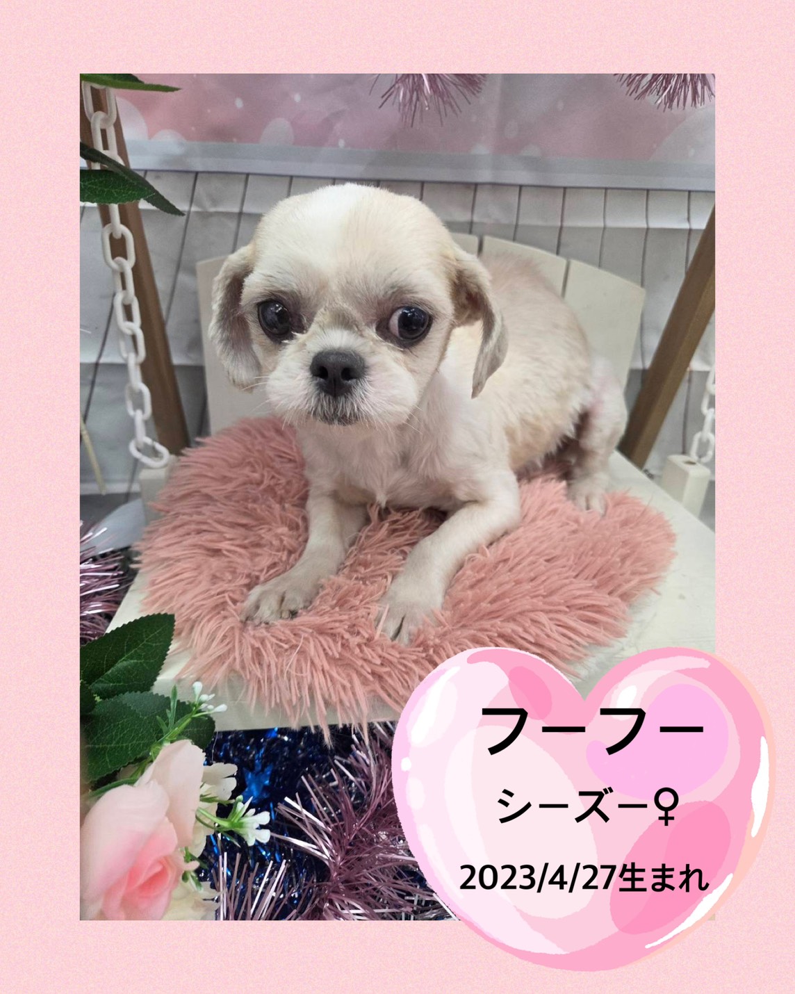 掲載日 2026.02.24 ユアペティア鎌ヶ谷店 優しい性格の女の子フーフー 名前 フーフー 品種 シーズー 性別 女の子 生年月日 2023/4/27 ワクチン接種 済み 避妊去勢手術 未 狂犬病予防接種 済み 健康診断 あり ノミマダニ予防 済み マイクロチップ 装着済み 犬:フィラリア検査 猫:エイズ、白血病検査 陰性 健康上の特記事項 鼠経ヘルニア左右(小) 2026/2/24現在体重4.6㎏ 穏やかな性格で他の子とも仲良く遊べています。若干人慣れしていないところも ありますが、実はイタズラっ子の元気いっぱいな女の子。もう少し体重を増やしたいので、オカリナと一緒にデブ活中です。 < 前のページへ 次のページへ >