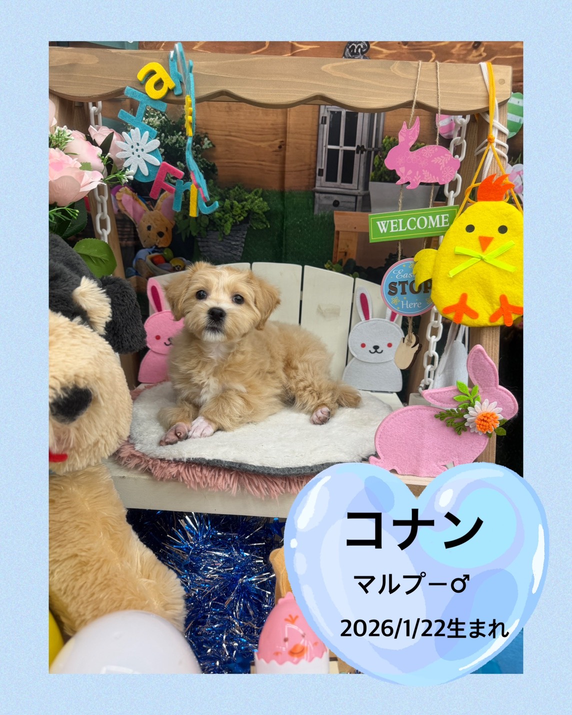 掲載日 2026.04.11 ユアペティア鎌ヶ谷店 しっぽフリフリで元気な男の子コナン 名前 コナン 品種 マルプー(父犬:マルチーズ.ホワイト.3.6㎏)(母犬:トイプードル.レッド.3.5㎏) 性別 男の子 生年月日 2026/1/22 ワクチン接種 済み 避妊去勢手術 未 狂犬病予防接種 未 健康診断 あり ノミマダニ予防 済み マイクロチップ 装着済み 犬:フィラリア検査 猫:エイズ、白血病検査 陰性 健康上の特記事項 2026/4/11現在体重1.92㎏ 人懐っこくて元気な男の子です!素敵なご縁に繋がりますように✨ パピーは正式譲渡は可能ですがワクチンプログラムが終了していない為トライアルは承れません。お気軽にお問い合わせください。 < 前のページへ 次のページへ >