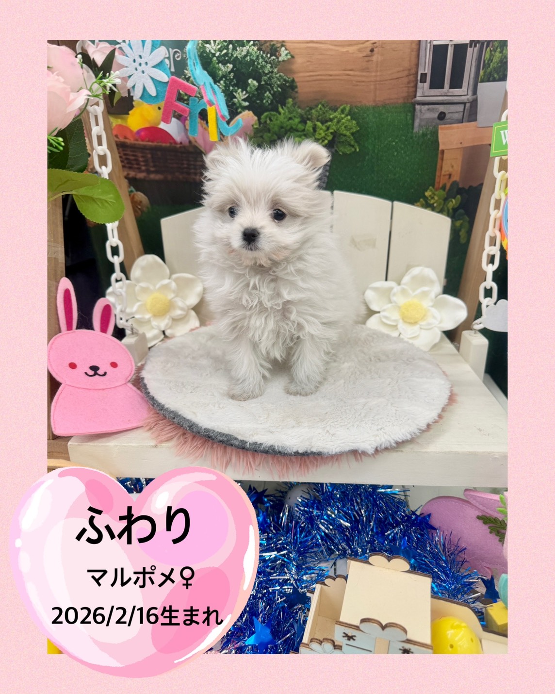 掲載日 2026.04.26 ユアペティア鎌ヶ谷店 優しい性格の女の子ふわり 名前 ふわり 品種 マルポメ(父犬:マルチーズ.母犬ポメラニアン・クリーム) 性別 女の子 生年月日 2026/2/16 ワクチン接種 済み 避妊去勢手術 未 狂犬病予防接種 未 健康診断 あり ノミマダニ予防 済み マイクロチップ 装着済み 犬:フィラリア検査 猫:エイズ、白血病検査 陰性 健康上の特記事項 心雑音あり:PDA3/6・泉門頭頂部(小)・右目小眼瞼 2026/4/26現在体重0.95㎏ とてもかわいらしい子です❤ 素敵なご縁に繋がりますように✨ < 前のページへ 次のページへ >