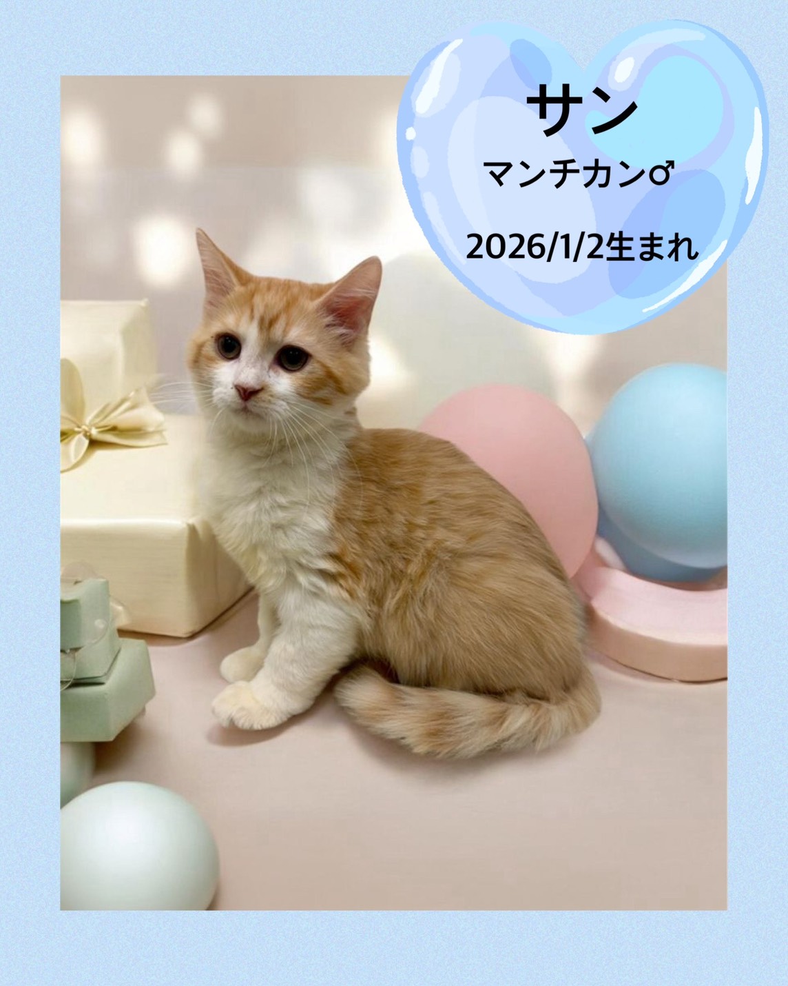 掲載日 2026.04.29 ユアペティア鎌ヶ谷店 つぶらな瞳が魅力的な男の子サン 名前 サン 品種 マンチカン 性別 男の子 生年月日 2026/1/2 ワクチン接種 済み 避妊去勢手術 未 狂犬病予防接種 猫のため不要 健康診断 あり ノミマダニ予防 未 マイクロチップ 装着済み 犬:フィラリア検査 猫:エイズ、白血病検査 陰性 健康上の特記事項 4/29現在体重1.9kg かわいらしく元気な男の子です❤ 素敵なご縁に繋がりますように✨ < 前のページへ 次のページへ >