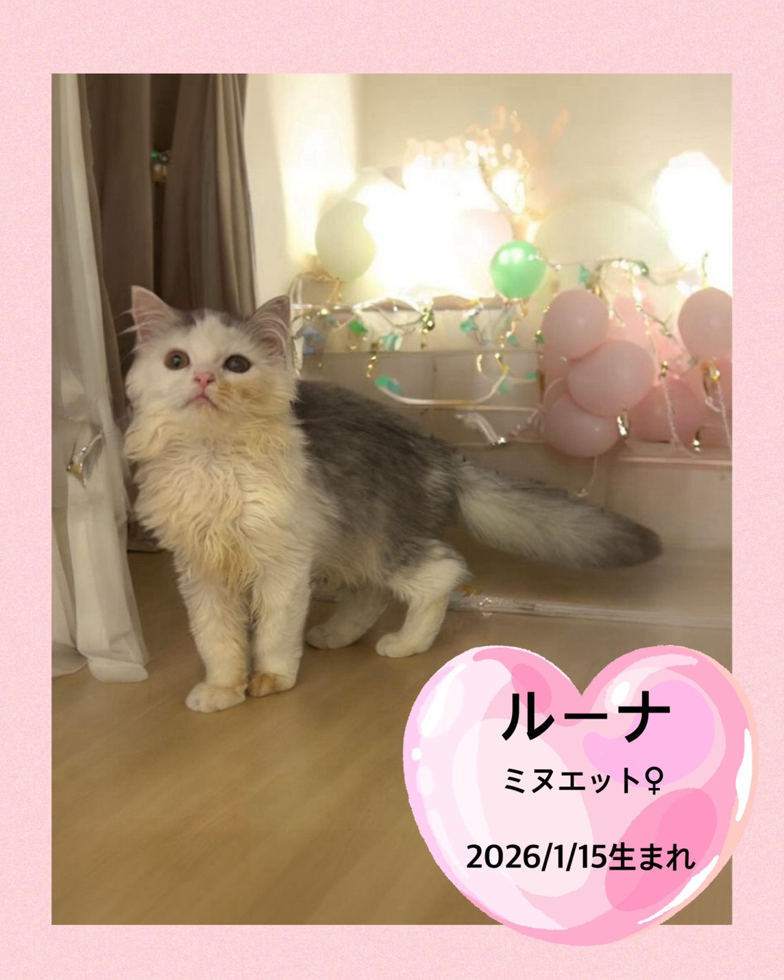 掲載日 2026.04.29 ユアペティア鎌ヶ谷店 人懐っこい性格の女の子ルーナ 名前 ルーナ 品種 ミヌエット 性別 女の子 生年月日 2026/1/15 ワクチン接種 済み 避妊去勢手術 未 狂犬病予防接種 猫のため不要 健康診断 あり ノミマダニ予防 未 マイクロチップ 装着済み 犬:フィラリア検査 猫:エイズ、白血病検査 陰性 健康上の特記事項 4/29現在体重1.2㎏ かわいらしい女の子です❤素敵なご縁に繋がりますように✨ < 前のページへ 次のページへ >