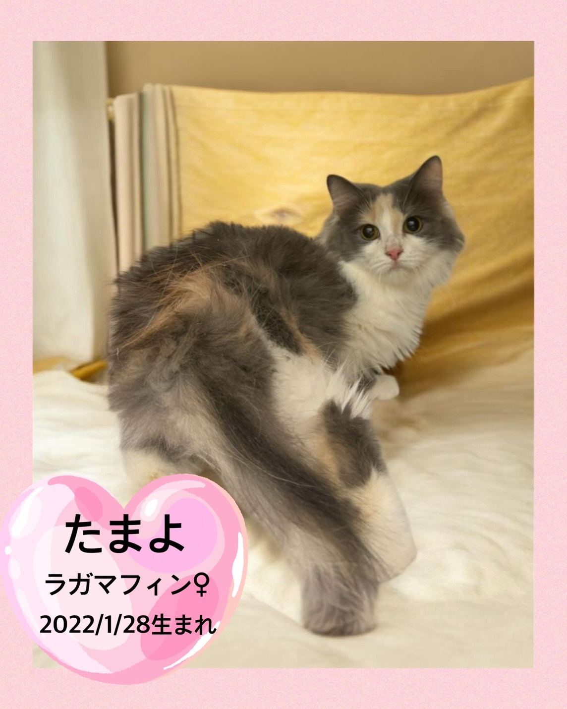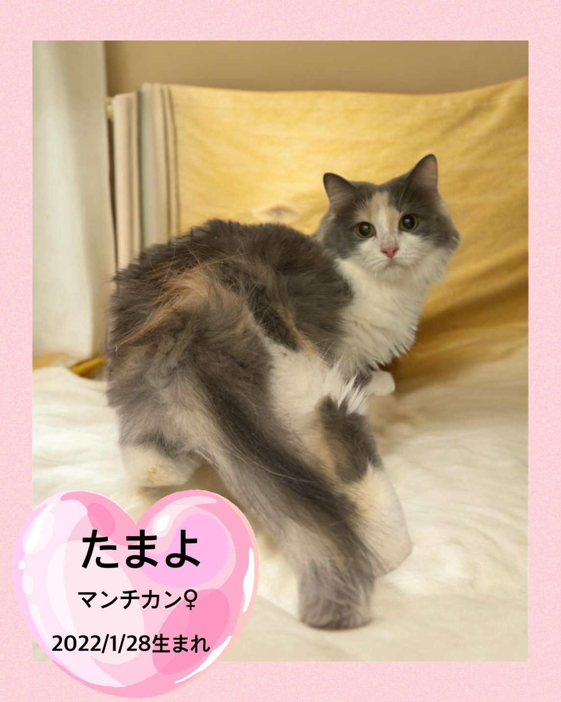 掲載日 2026.04.29 ユアペティア鎌ヶ谷店 控え目で穏やかな性格の女の子たまよ 名前 たまよ 品種 マンチカン 性別 女の子 生年月日 2022/1/28 ワクチン接種 済み 避妊去勢手術 未 狂犬病予防接種 猫のため不要 健康診断 あり ノミマダニ予防 未 マイクロチップ 装着済み 犬:フィラリア検査 猫:エイズ、白血病検査 陰性 健康上の特記事項 4/29現在体重2.9㎏ < 前のページへ 次のページへ >